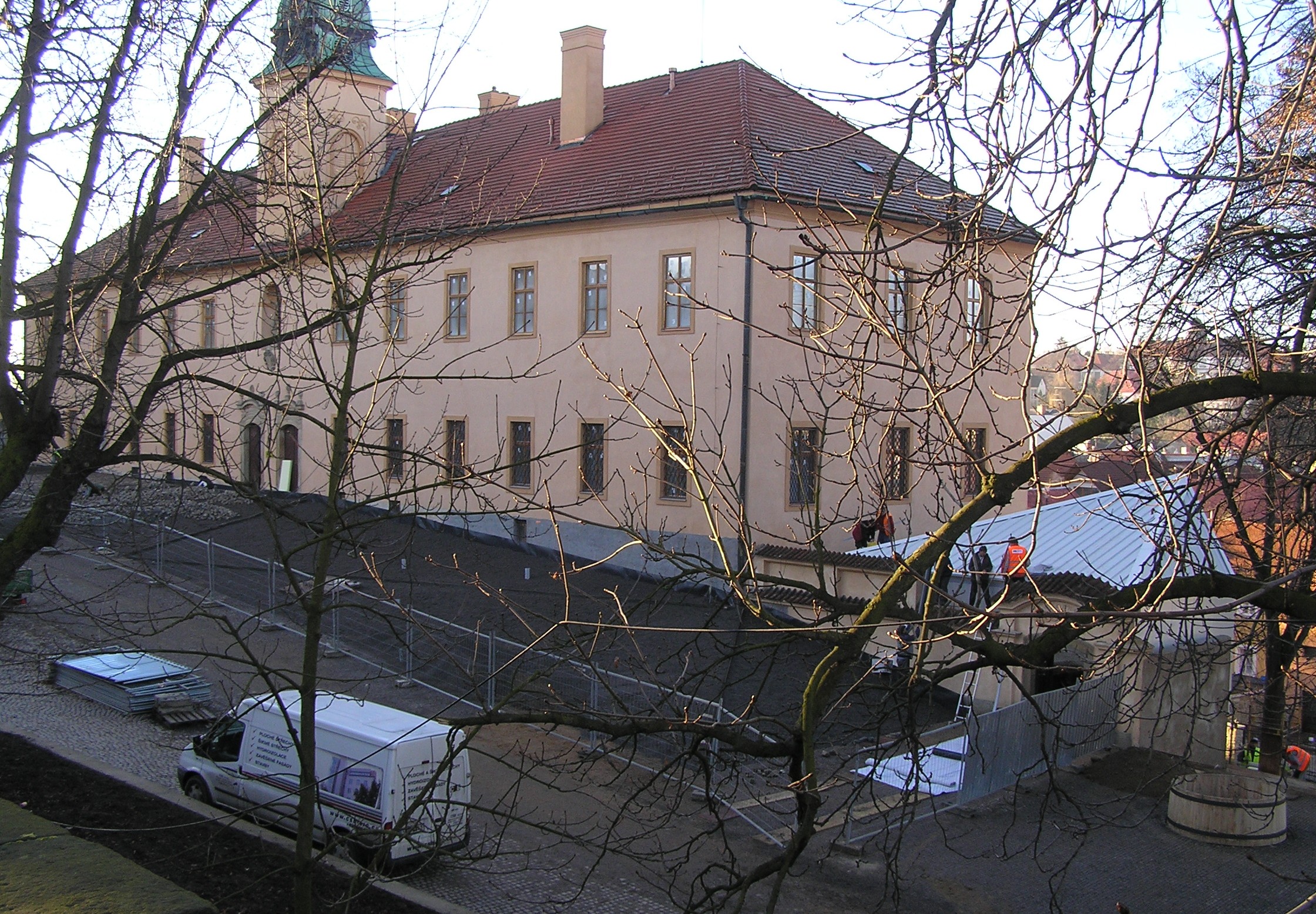 Stavební práce: V historické budově probíhají práce ve všech interiérech (např. pokládka podlahového topení) i v exteriéru (oprava fasády, komínů, zasazení nových oken aj.).